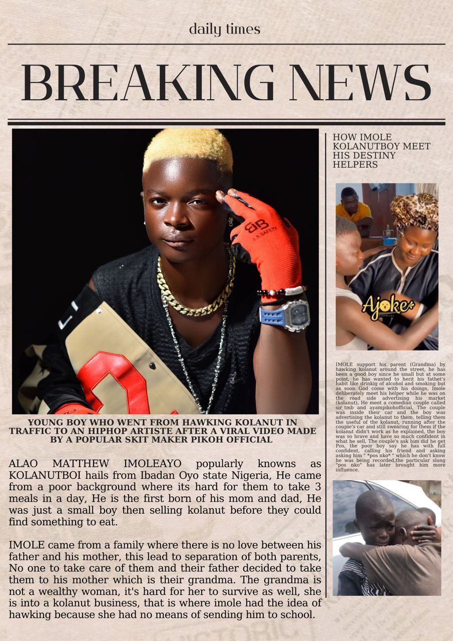 ALAO MATTHEW IMOLEAYO popularly knowns as KOLANUTBOY hails from Ibadan Oyo state Nigeria, He came from a poor background where its hard for them to take 3 meals in a day, He is the first born of his mom and dad, He was just a small boy then selling kolanut before they could find something to eat.
